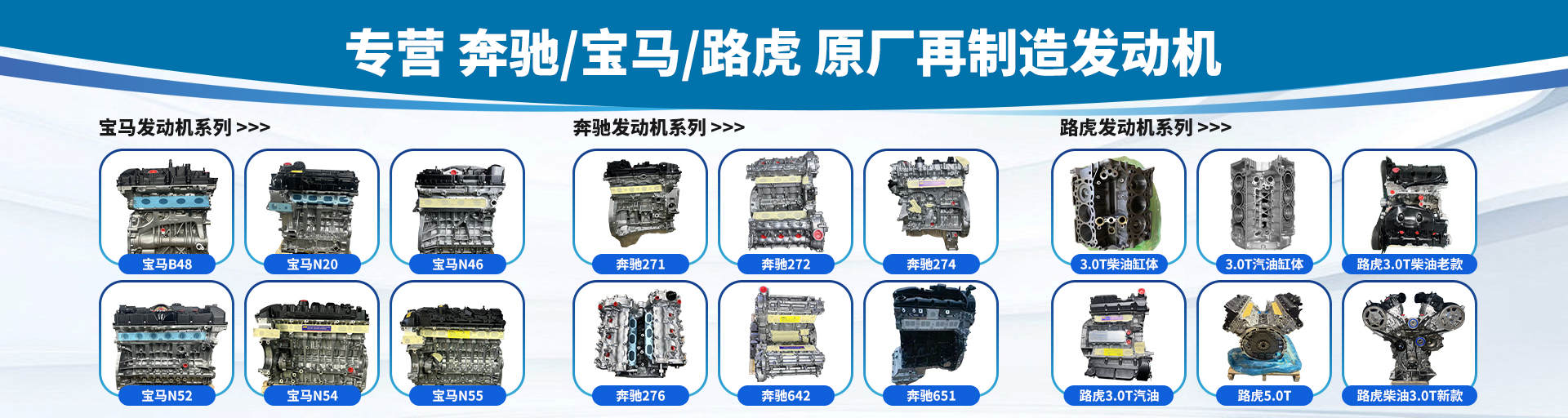 公司主营宝马(N52、N55、B48等系列)、奔驰(M270、M274、OM642等系列)及路虎(柴油/汽油3.0)等主流型号的再制造发动机。所有产品均采用原产地核心机体及100%纯拆零配件,从源头保障正品品质。每一台发动机、每一个零件在出厂前均经过多重严格质检流程,我们只出精品,坚决杜绝次品。